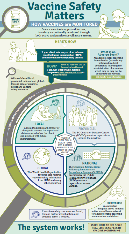 B.C. monitors adverse events following immunization through the immunization surveillance system and reports to the